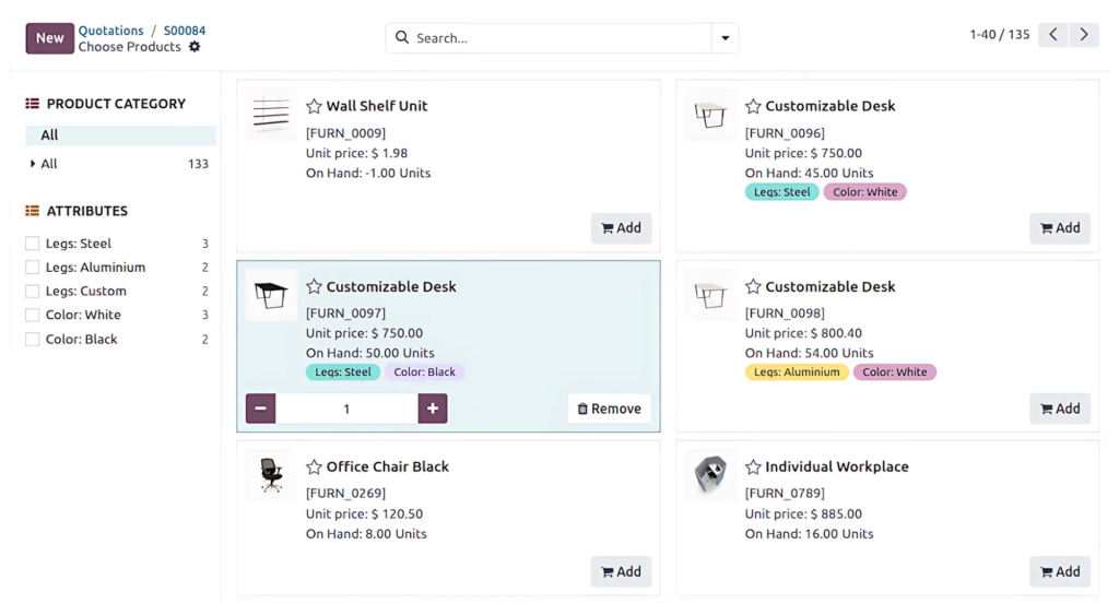 - Biến thể sản phẩm: Tùy chỉnh cấu hình sản phẩm với nhiều nhiều thuộc tính và biến thể như kích thước, màu sắc, thành phần, đơn vị tính,… Quản lý nhiều loại sản phẩm khác nhau (sản phẩm lưu kho, dịch vụ, tiêu thụ, phí giao hàng và sản phẩm điện tử).